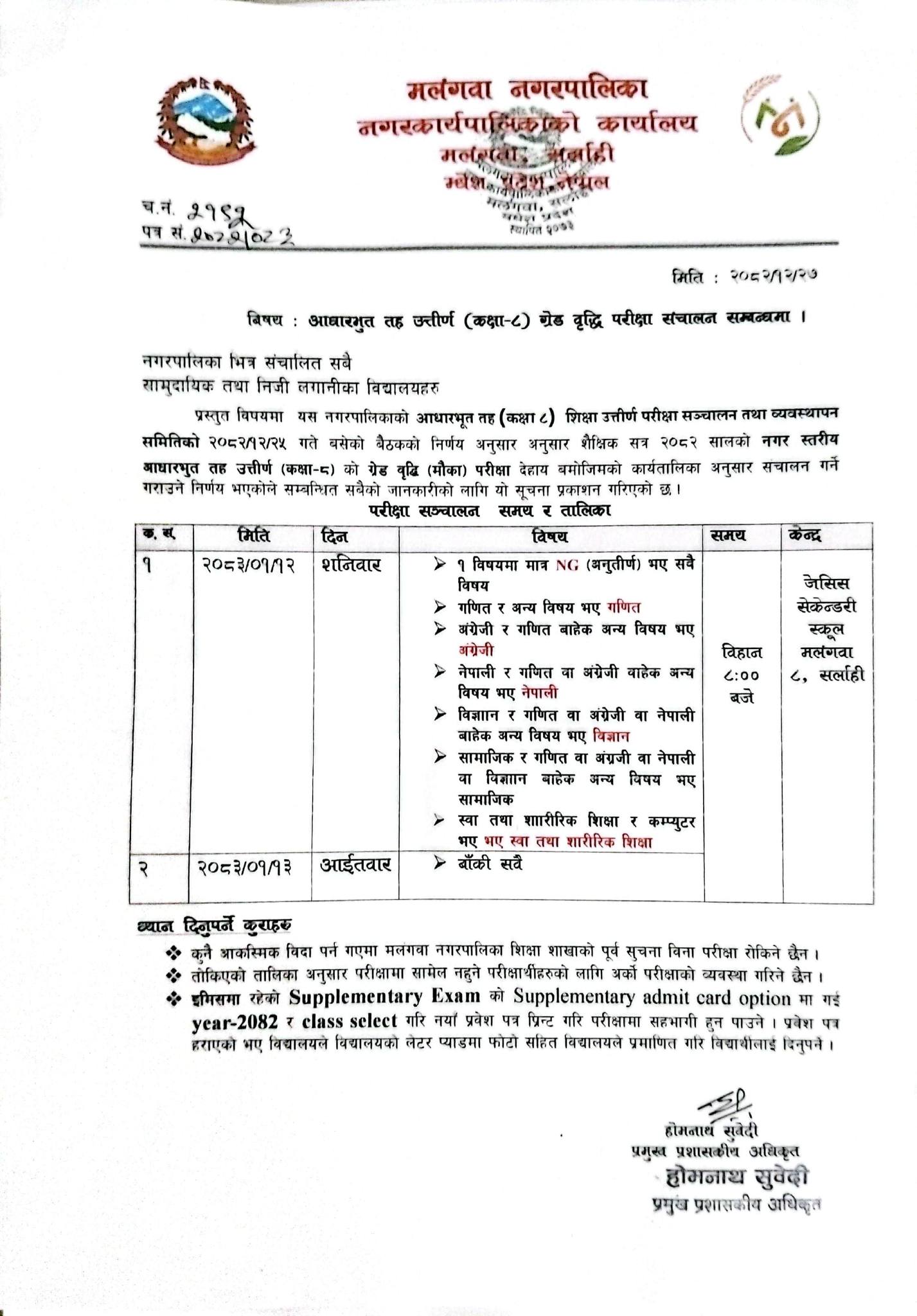 शैक्षिक सत्र २०८२ काे कक्षा ८ काे ग्रेडवृद्वि परीक्षाकाे समय तालिका, २०८३ बैशाख १२ र १३ हुने।